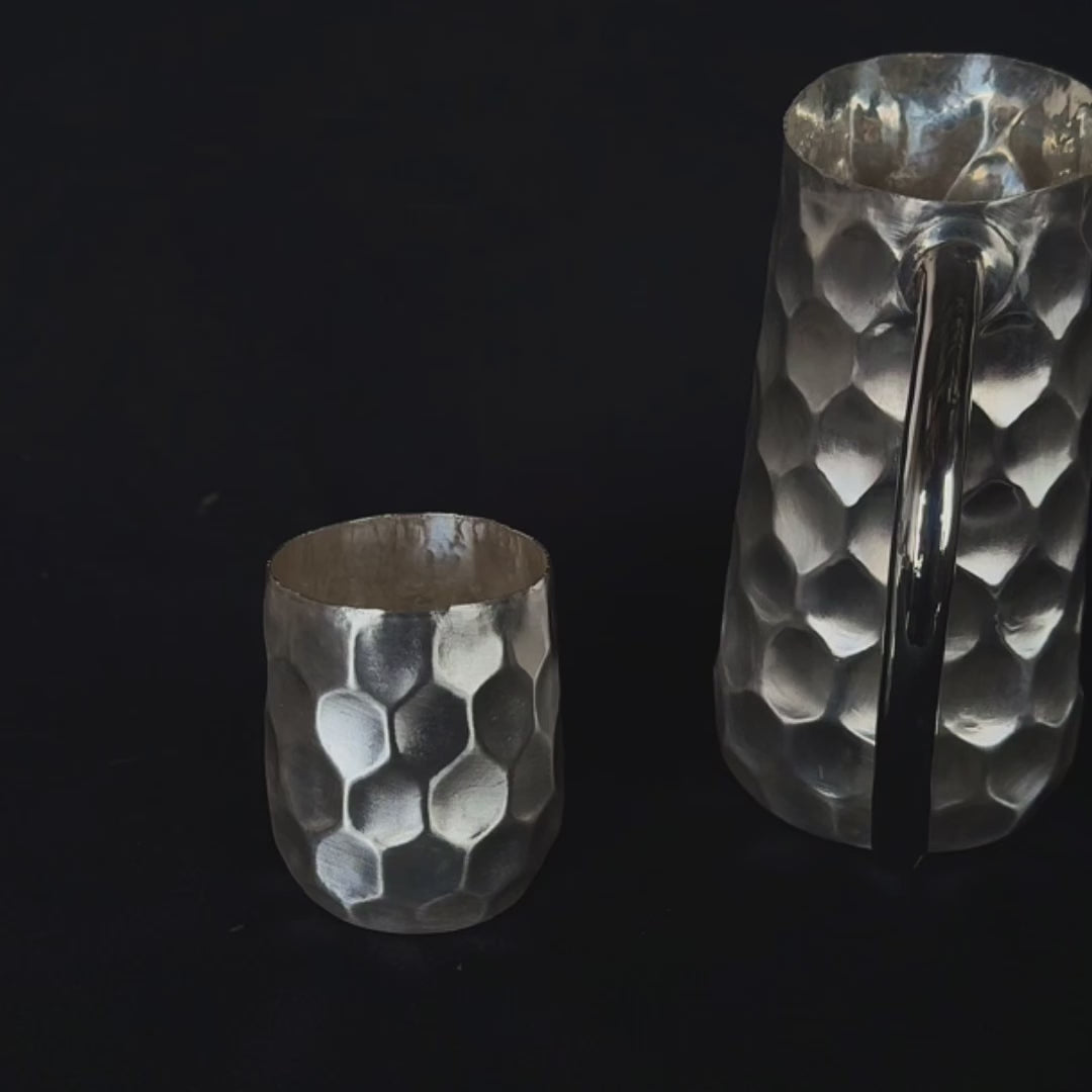Cada pieza de nuestro Set de Noche "Luna de Miel" no solo es un testimonio de la tradición artesanal, sino también una inversión en belleza y calidad. Añade un toque de sofisticación a tu hogar y disfruta del lujo de la plata trabajada a mano. Al beber agua de estos recipientes, no solo disfrutas de sus beneficios para la salud, sino que también te conectas con una rica tradición histórica.